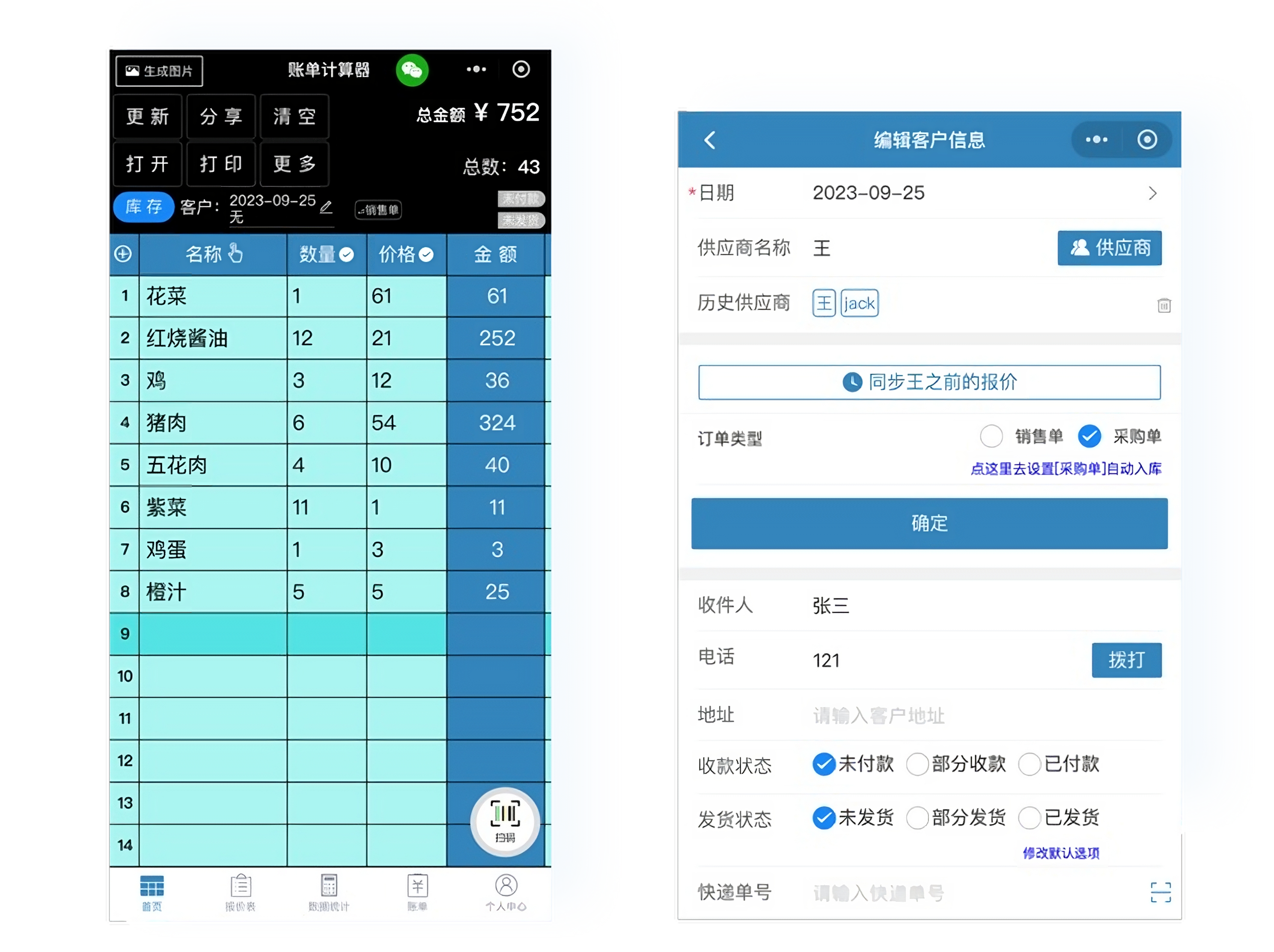 报价单可分享、可一键点击加入销售单、采购单,买家卖家都可以开单。